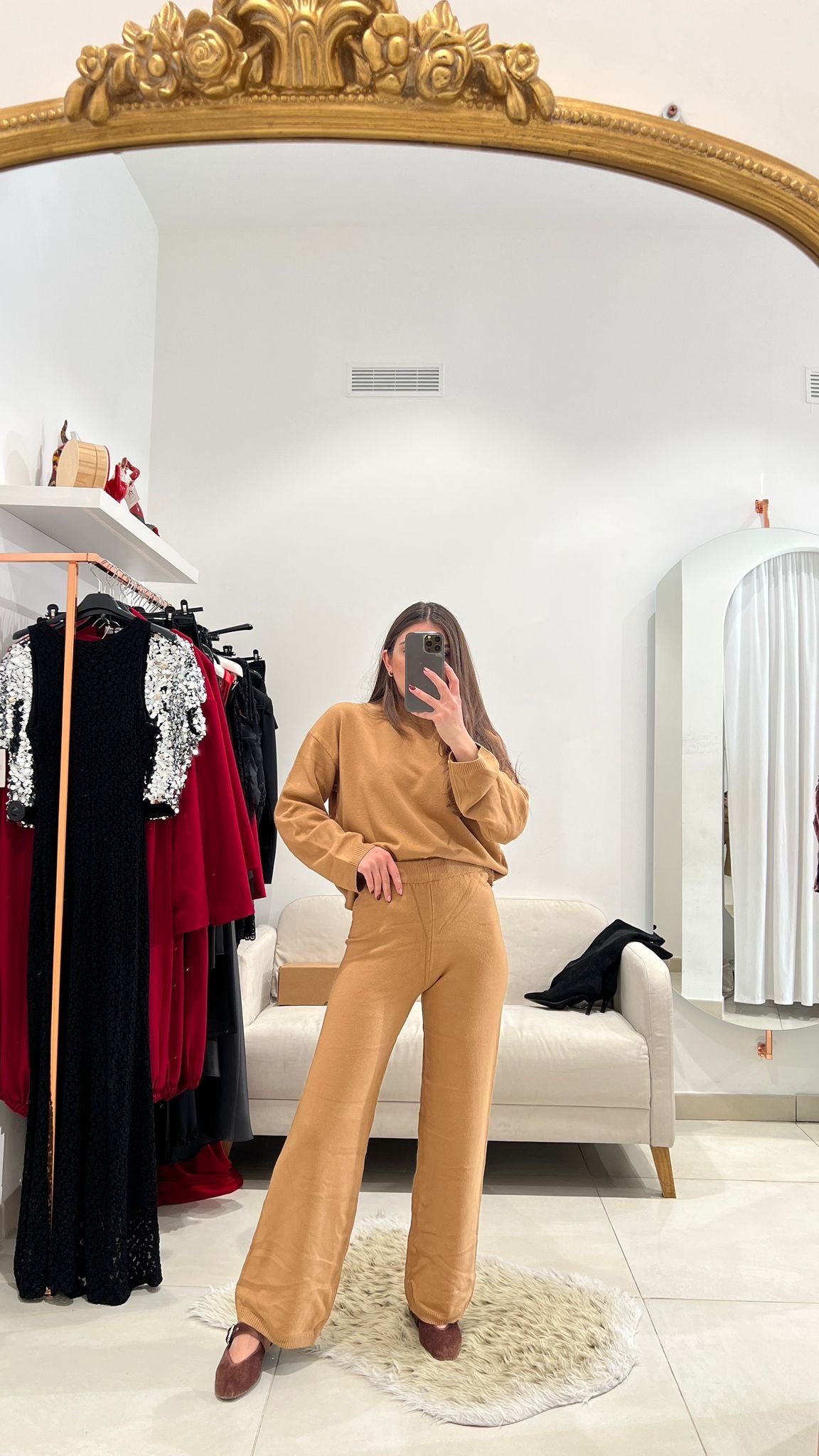 Coordinato in lana rasata con pantalone a palazzo e magliettone girocollo, veste fino a 48