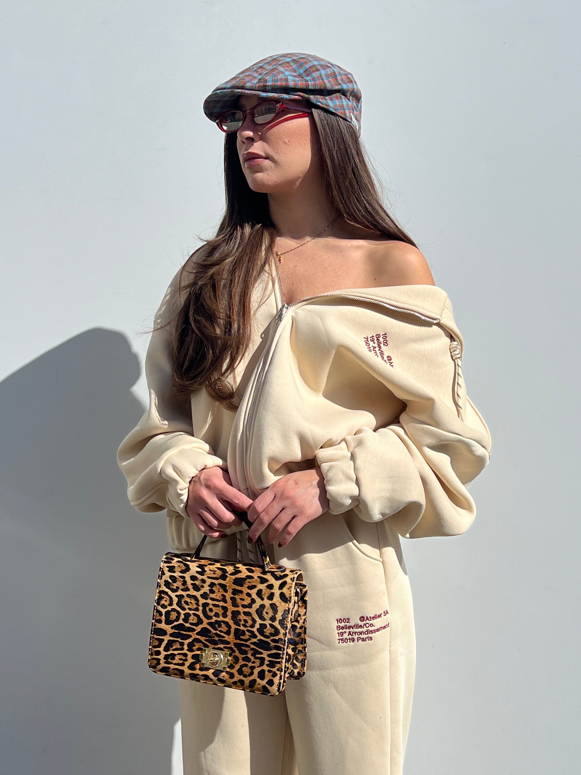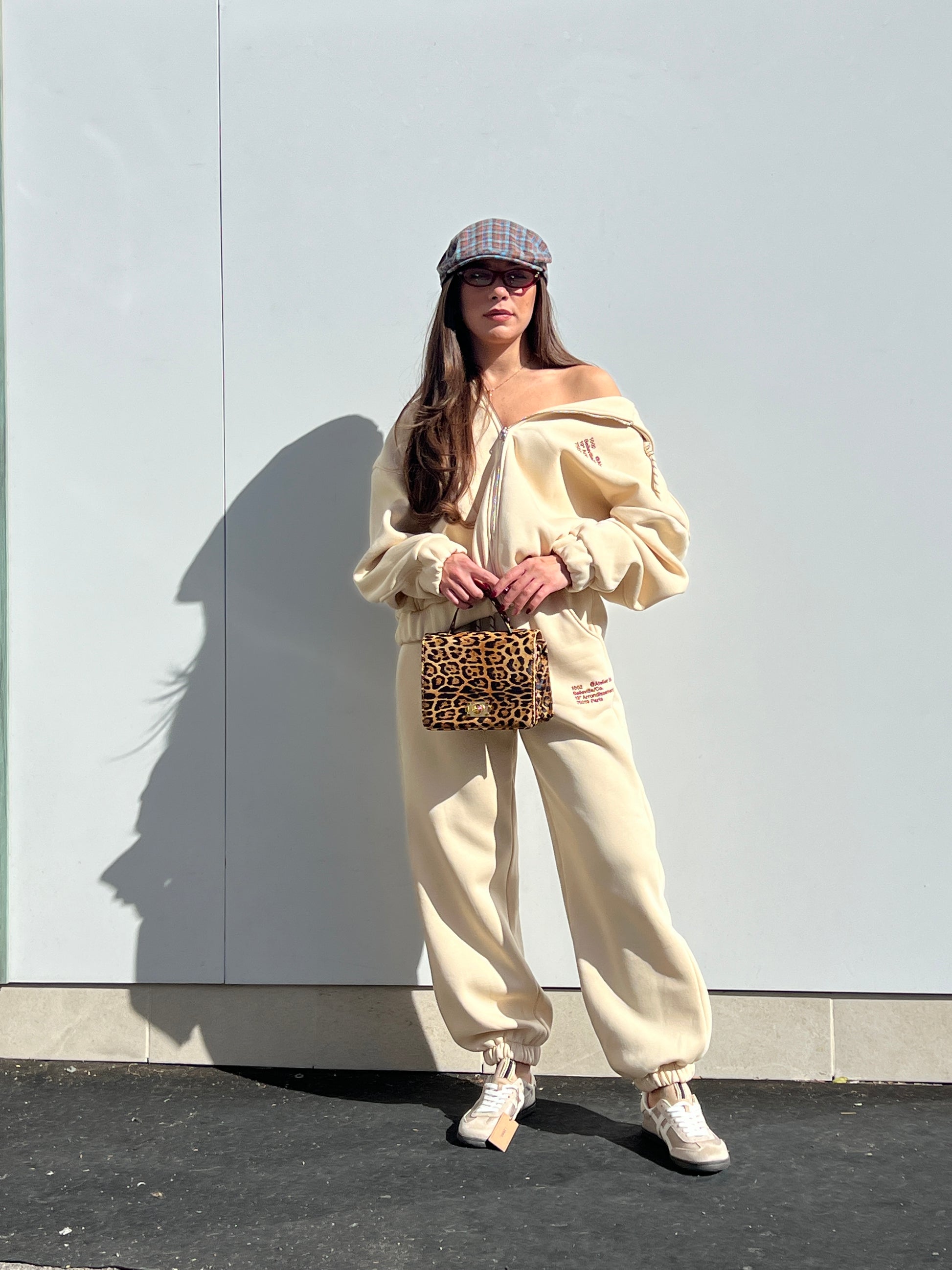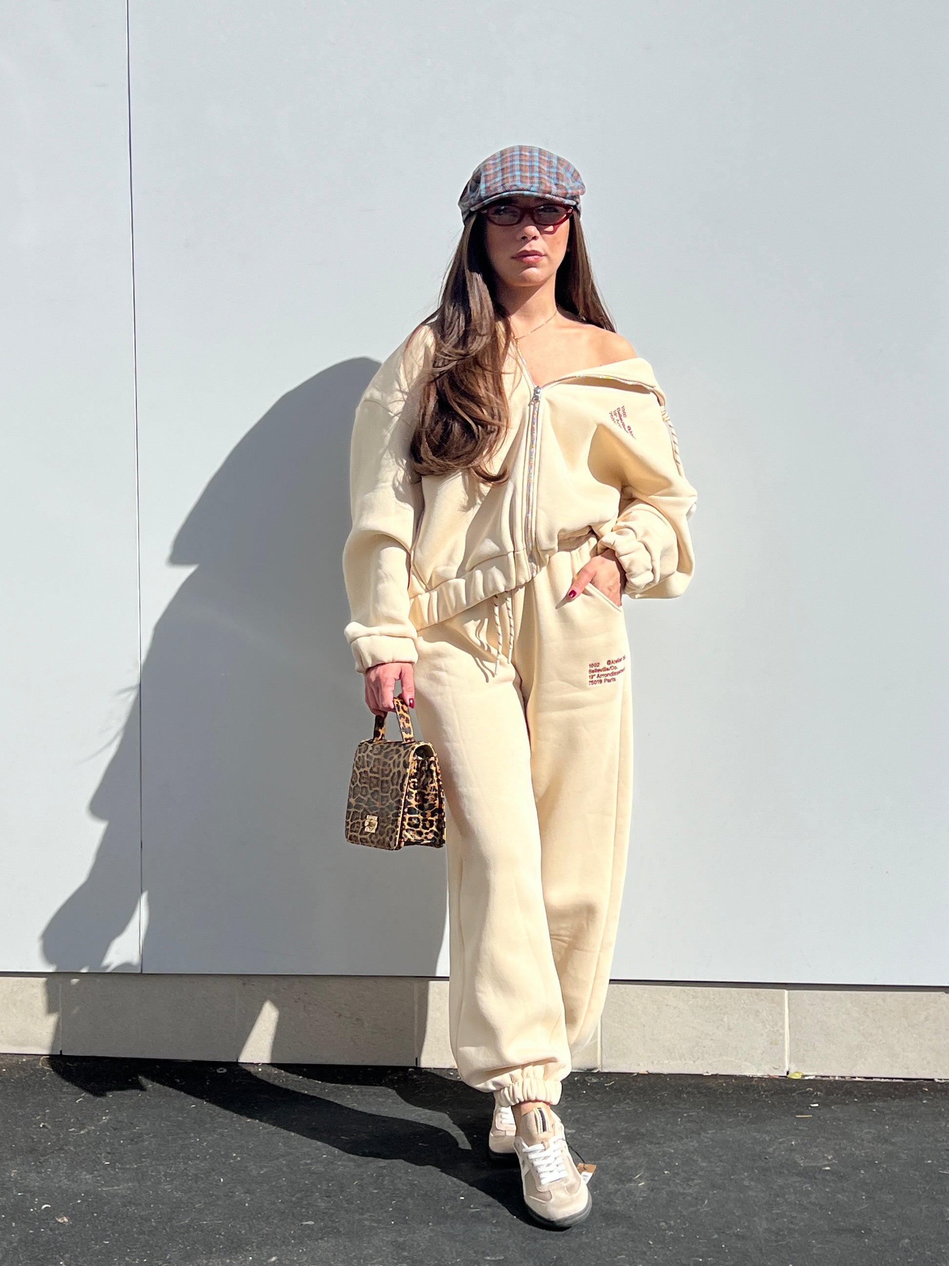 Coordinato in tuta felpata e caldissima, by Lumina, felpa lunga panna con zip e pantalone con elastico alla caviglia