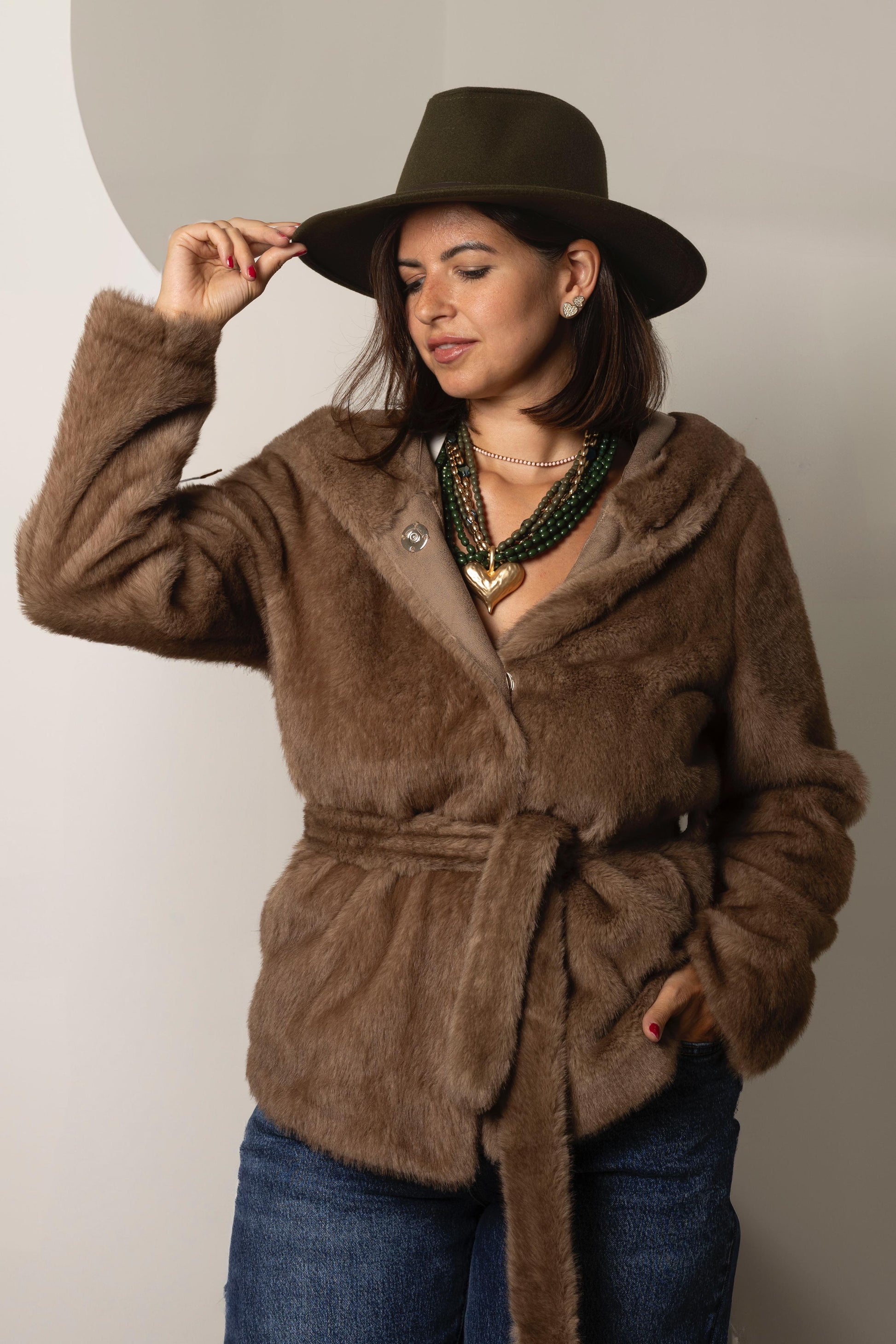 Ecopelliccia con bottone clip e cinturone, vestibilità over.
