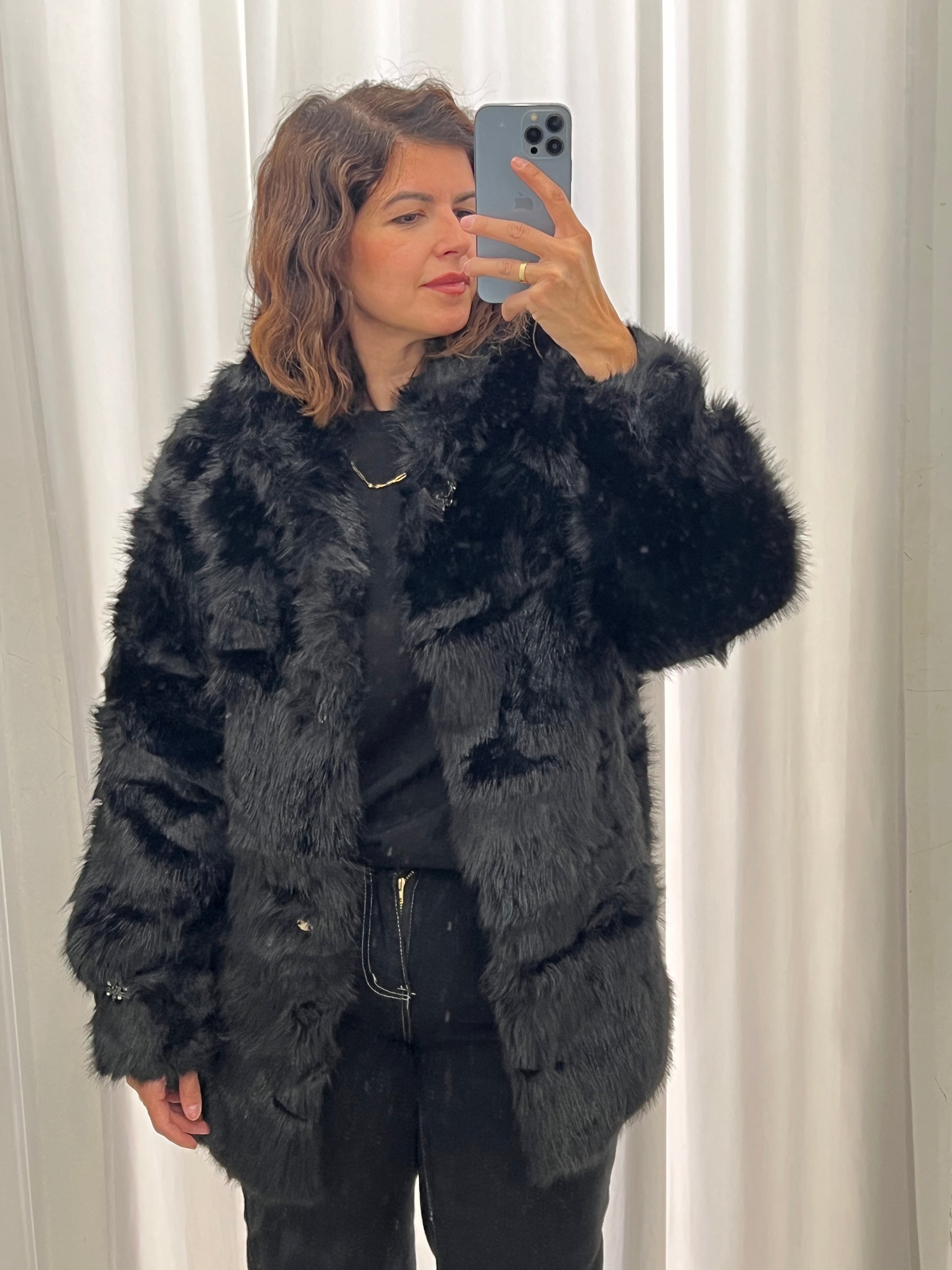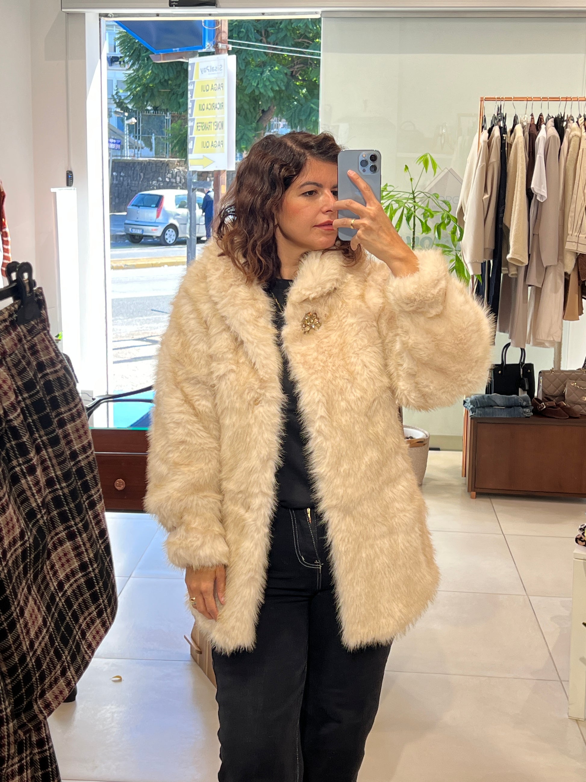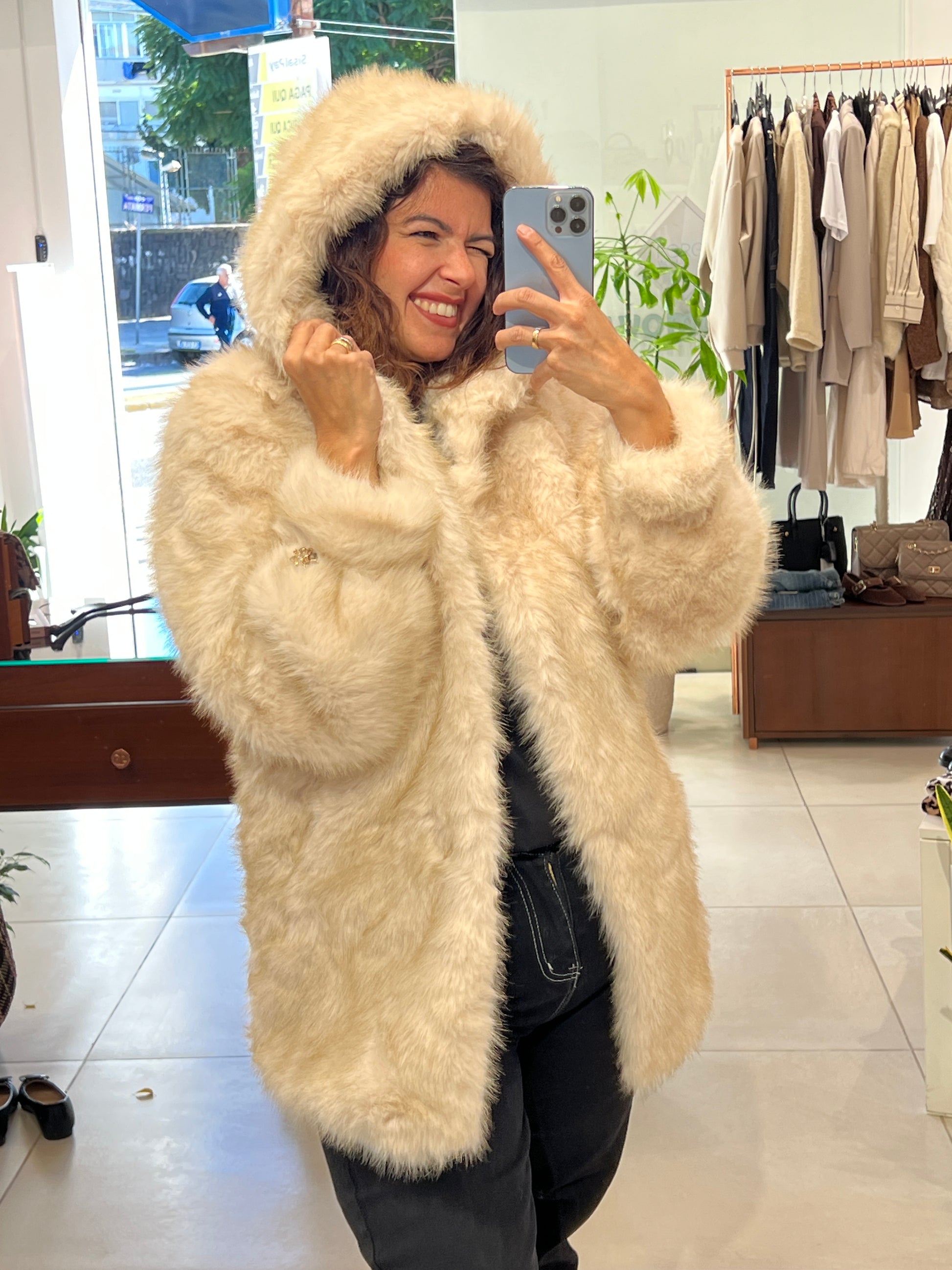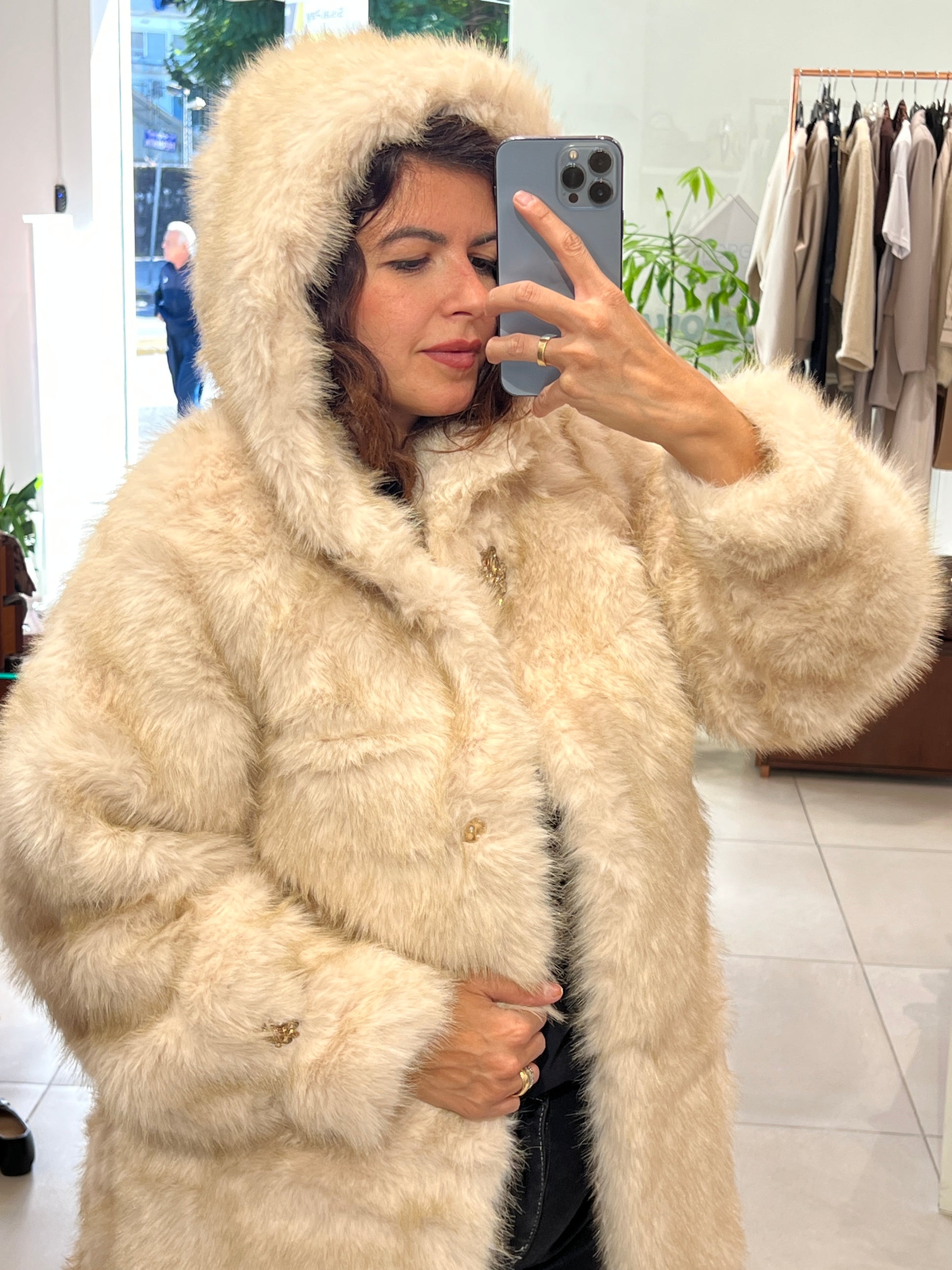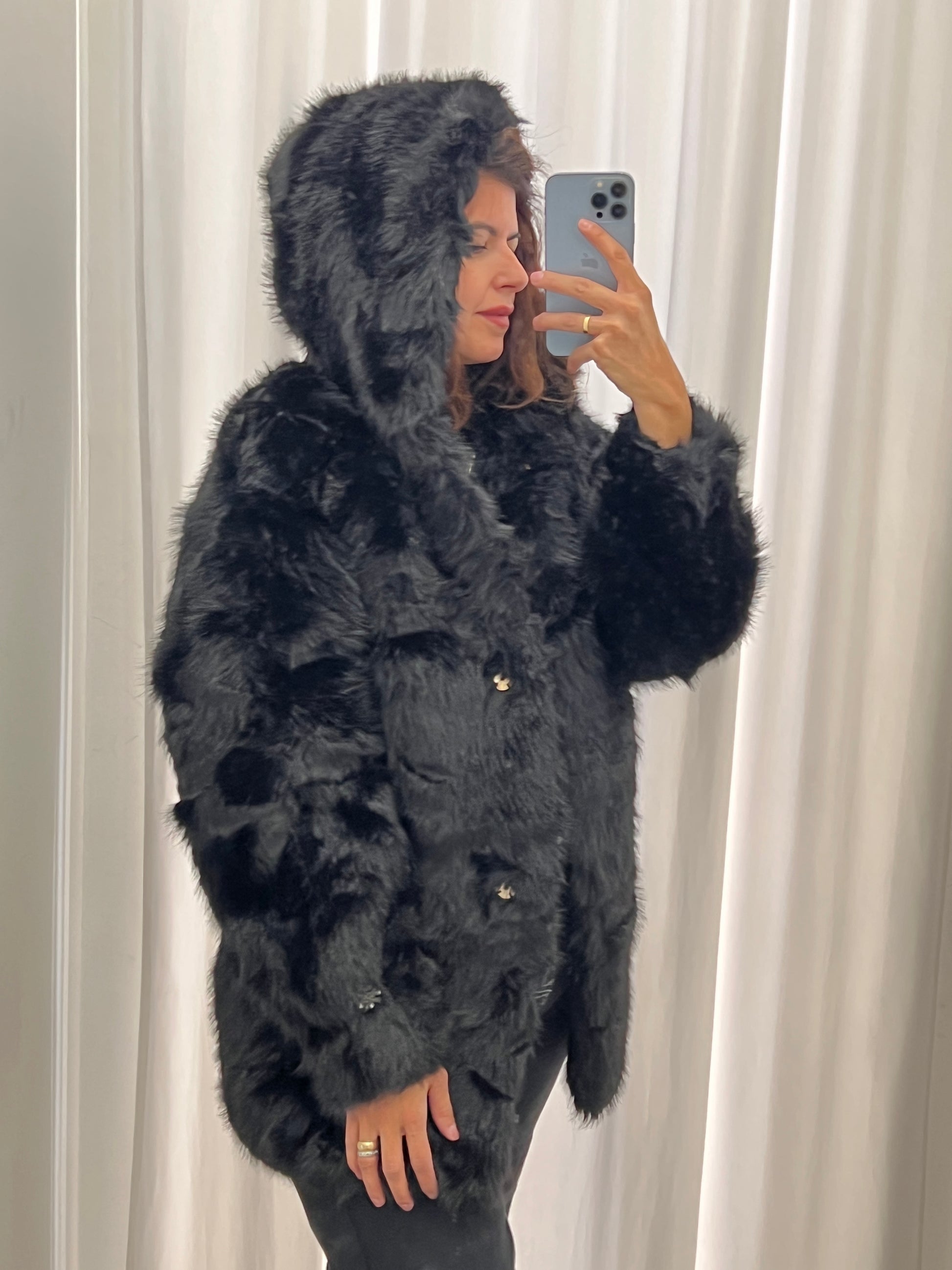 Ecopelliccia morbidissima con cappuccio e bottoncino alla gola.