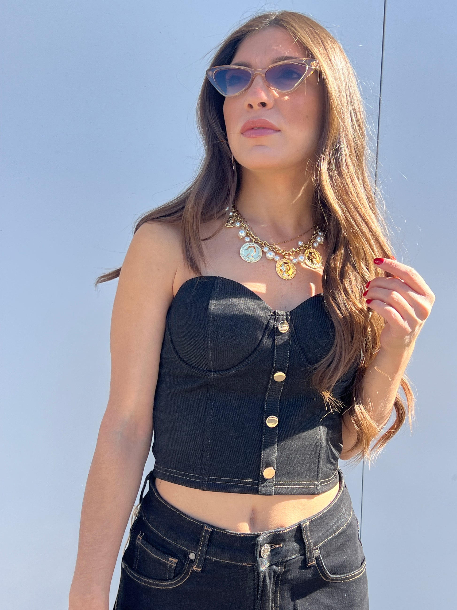 Corpetto con finti bottoncini sul davanti e elastico sul retro, veste fino a 44-46